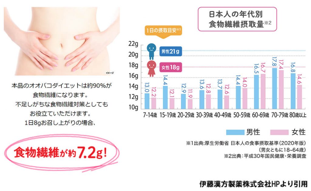 日本人の食事摂取基準によると、生活習慣病の発症予防の観点から認められた、成人における理想的な食物繊維の摂取量は1日あたり24g以上です。令和元年国民健康・栄養調査の結果では、日本人の食物繊維摂取量は不足がちとされています。