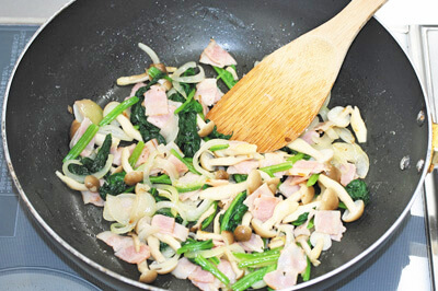 玉ねぎがしんなりしたら、準備しておいたほうれん草を加えてさっと炒め、粗熱を取る。