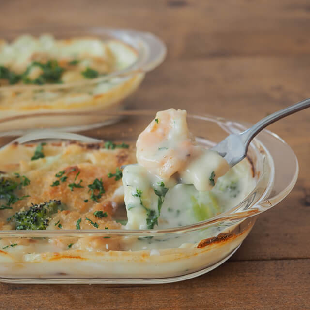 オール耐熱ガラスのシンプルなデザインのグラタン皿。市販のグラタンの素1人分と野菜等の具材も入るサイズ感。色やにおい移りがしにくく、衛生的に使えます。