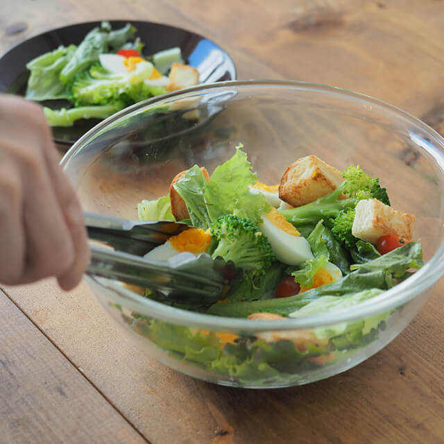 熱湯・電子レンジ・オーブン・食洗器OKの耐熱ガラス製ボウル。こねる、混ぜるがしやすい浅型形状で、下準備から食卓まで幅広くお使いいただけます。
