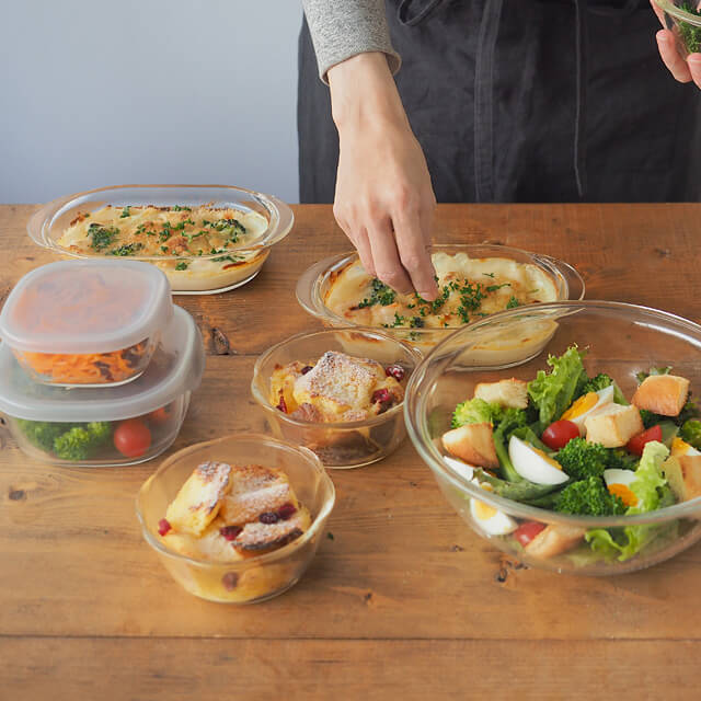レンジ・オーブンで簡単調理ができ、食器としても使いやすい耐熱ガラスシリーズがお得なセットになりました。