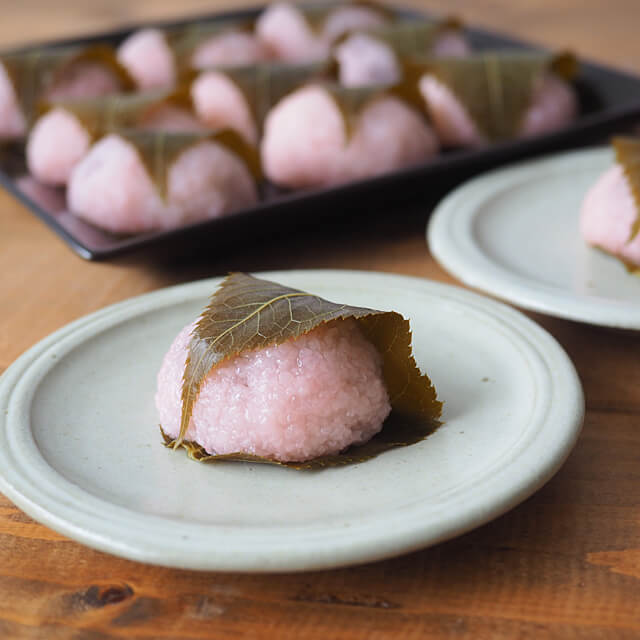 | 桜もち(道明寺)の作り方 | 道明寺 250g 上白糖 100~130g(お好みにより加減してください) 水 380ml 食紅 少々 あずきあん 220g 桜の葉 12枚 (1)道明寺に半量の水を加えて1時間程度そのままにしてふやかします。 (2)蒸し器に布巾を敷き、(1)を平らにならして約20分間蒸します。 (3)鍋に残りの水と上白糖を入れ、食紅を少量入れ火にかけ、沸騰したら火からおろして(2)を入れ混ぜ合わせます。 (4)蜜を十分に含ませるため、 ラップをして密封し、約20分放置します。 (5)(4)を12等分し、あんを包み桜の葉で巻きます。 |