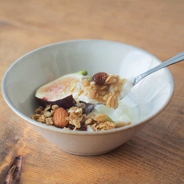 オーツ麦をベースに国産の焙煎玄米を加え、ドライフルーツとアーモンドをミックスした甘さ控えめのグラノーラです。不足しがちな食物繊維やビタミンEが摂取できます。