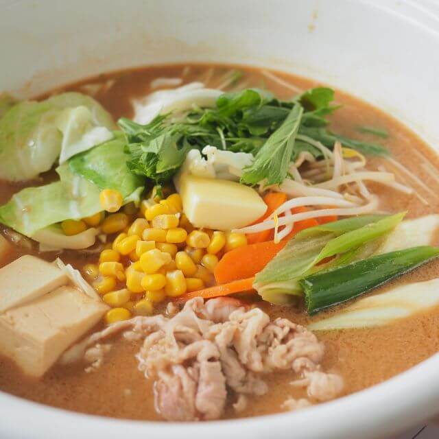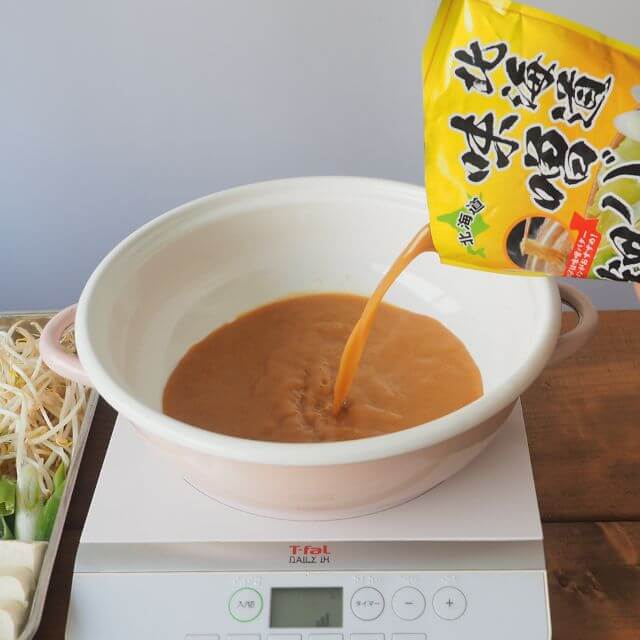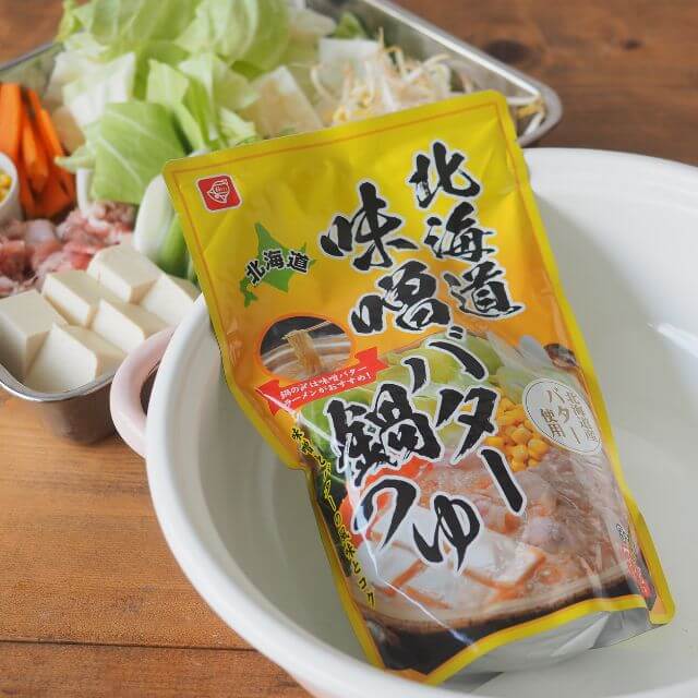 白味噌と赤味噌の合わせ味噌に北海道産バターの風味とコクを効かせた濃厚な味噌バター味の鍋つゆです。