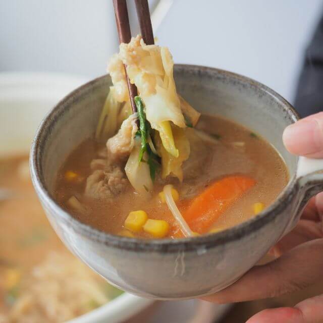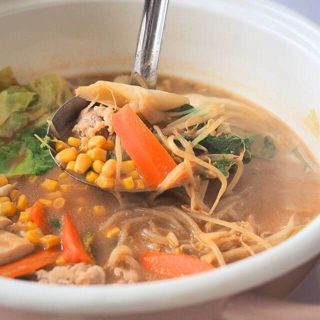 | 作り方 | 【材料例(3~4人前)】 本品…1袋 豚肉…300g キャベツ…1/4玉 にんじん…1/4本 長ねぎ…1本 もやし…1袋 ホールコーン…50g 豆腐…1丁 【作り方】 1)本品をよく振ります。袋の中に味噌の固形分や油脂分が残ることがありますのでよく振ってからお使いください。 2)鍋に入れて沸騰させます。 3)お好みの具材を加え、煮込んでください。 4)鍋の〆に中華めんを入れてひと煮立ちさせてください。生ラーメンを使用する際には軽く下茹でしてください。 |