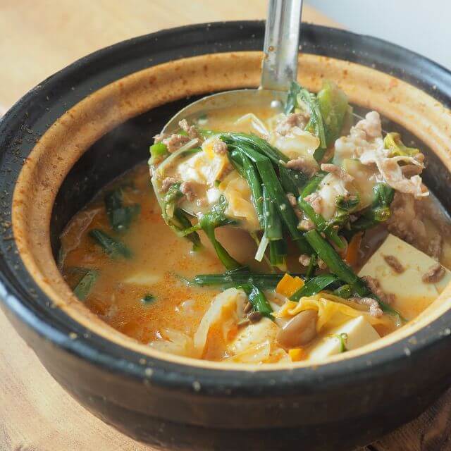 | 作り方 | 【材料例(3~4人前)】 本品…1袋 豚肉…200g 豚挽き肉…200g キャベツ…1/4個 チンゲンサイ…1株 しめじ…1パック 長ねぎ…1本 にんじん…1/4本 豆腐…1/2丁 【作り方】 1)本品をよく振ります。 ※袋の中にごまや香辛料などの固形物や油脂分が残ることがありますので、よく振ってからお使いください。 2)鍋に入れて沸騰させます。 3)お好みの具材を加え、煮込んでください。 4)鍋の〆に中華めんを入れてひと煮立ちさせてください。生ラーメンを使用する際には軽く下茹でしてください。 |