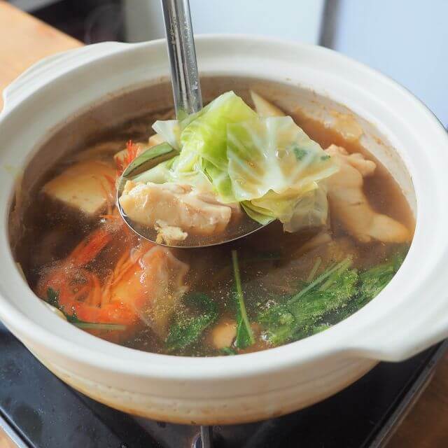 | 作り方 | 【材料例(3~4人前)】 本品…1袋 鶏肉…250g キャベツ…1/4個 しめじ…1パック にんじん…1/4本 長ねぎ…1本 水菜…1/2束 豆腐…1/2丁 【作り方】 1)本品をよく振ります。 2)鍋に入れて沸騰させます。 3)お好みの具材を加え、煮込んでください。 4)鍋の〆にカレールウを1皿分を目安にお好みの量を入れて煮込んでください。 |