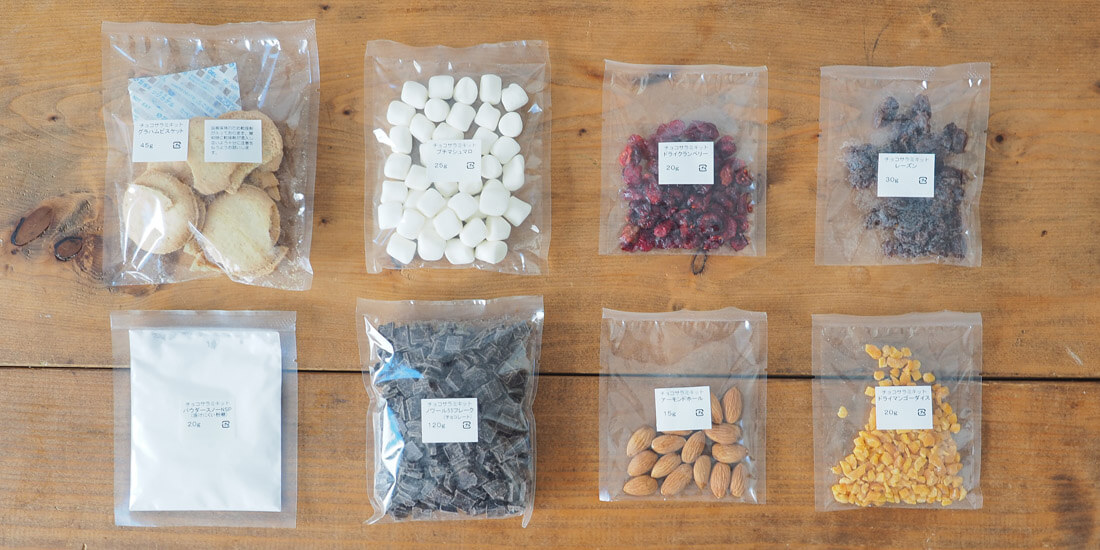 | セット内容 | 《不二製油》クーベルチュールノワール55フレーク(スイートチョコレート) 120g、グラハムビスケット 45g、プチマシュマロ 25g、アーモンドホール 15g、ドライマンゴーダイス 20g、ドライクランベリー 20g、カリフォルニアレーズン 30g、パウダースノーNSP(溶けにくい粉糖) 20g |