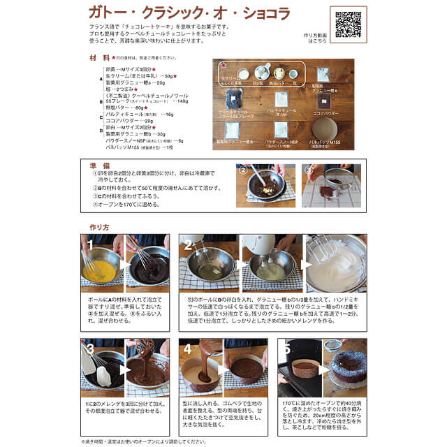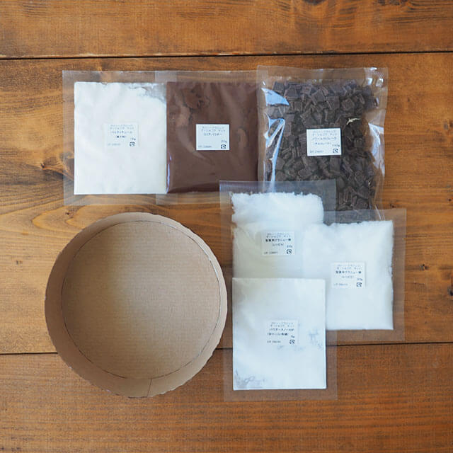 | セット内容 | 製菓用グラニュー糖 20g・30g、<不二製油> クーベルチュールノワール55フレーク(スイートチョコレート) 140g、パルティキュール(薄力粉) 16g、ココアパウダー 20g、パウダースノーNSP (溶けにくい粉糖) 6g、パネバッソM155(紙製焼き型) 1枚 |