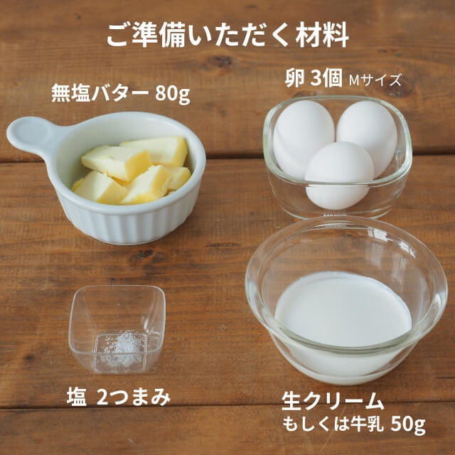 卵黄Mサイズ3個、生クリーム(または牛乳) 50g、塩2つまみ、無塩バター80g、卵白Mサイズ2個