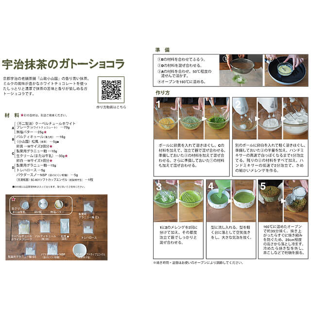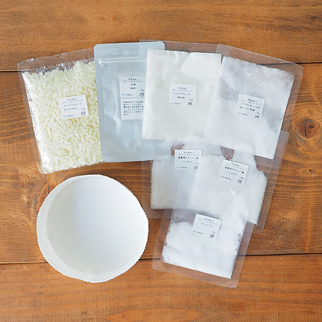 | セット内容 | 《不二製油》クーベルチュールホワイトフレーク(ホワイトチョコレート)70g、パルティキュール(薄力粉)16g、《小山園》松風(抹茶)5g、製菓用グラニュー糖10g、製菓用グラニュー糖15g、トレハロース5g、パウダースノーNSP(溶けにくい粉糖)5g、《天満紙器》SC-801ソフトカップエンゼル(紙製焼き型)1枚 |