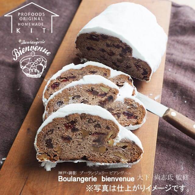 神戸の人気ブーランジェリー『ビアンヴニュ』の大下尚志氏監修の『ショコラシュトーレンキット』。濃厚なチョコレート生地にたっぷり入ったチョコチップ、クルミとドライクランベリーのバランスのとれた甘さとコク、しっとりとした食感が魅力です。
