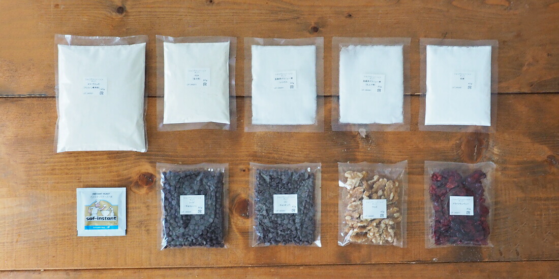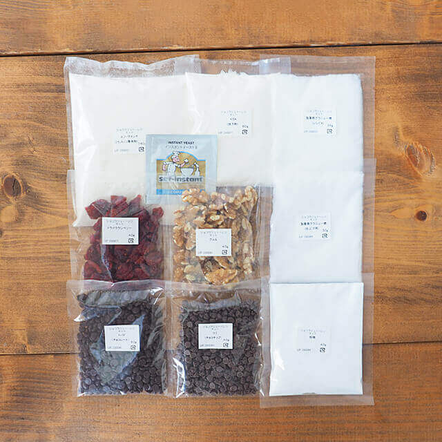 | 内容量 | 489g(フランスパン専用粉140g、チョコレート100g、砂糖66g、小麦粉60g、果実加工品40g、クルミ40g、粉糖40g、インスタントドライイースト3g) |