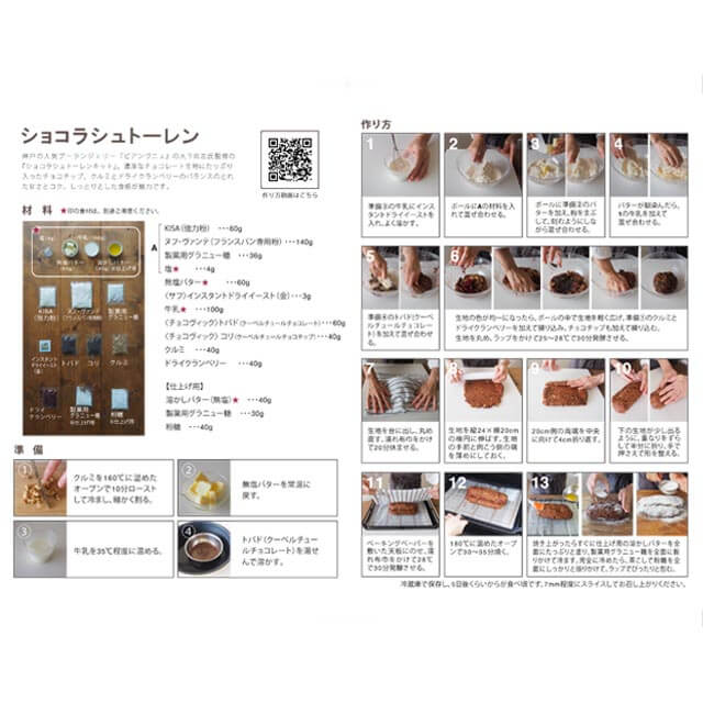 | セット内容 | KISA(強力粉) 60g、ヌフ・ヴァンテ (フランスパン専用粉) 140g、製菓用グラニュー糖 36g・30g、<サフ>インスタントドライイースト(金)3g、<チョコヴィック>トバド(クーベルチュールチョコレート)60g、<チョコヴィック>コリ(クーベルチュールチョコチップ)40g、クルミ 40g、ドライクランベリー 40g、粉糖 40g ※粉糖は特性上固まりやすくなっておりますが、品質には問題ございません。 |