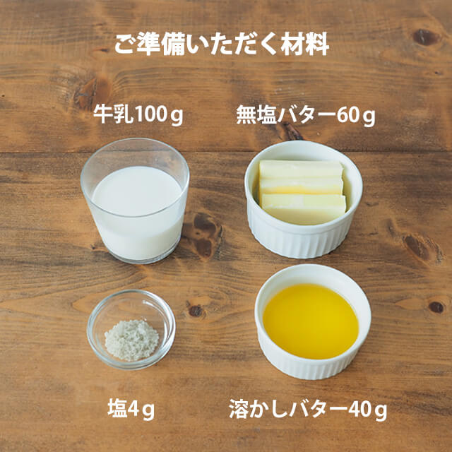 ・塩 4g ・無塩バター 60g+40g ・牛乳 100g |