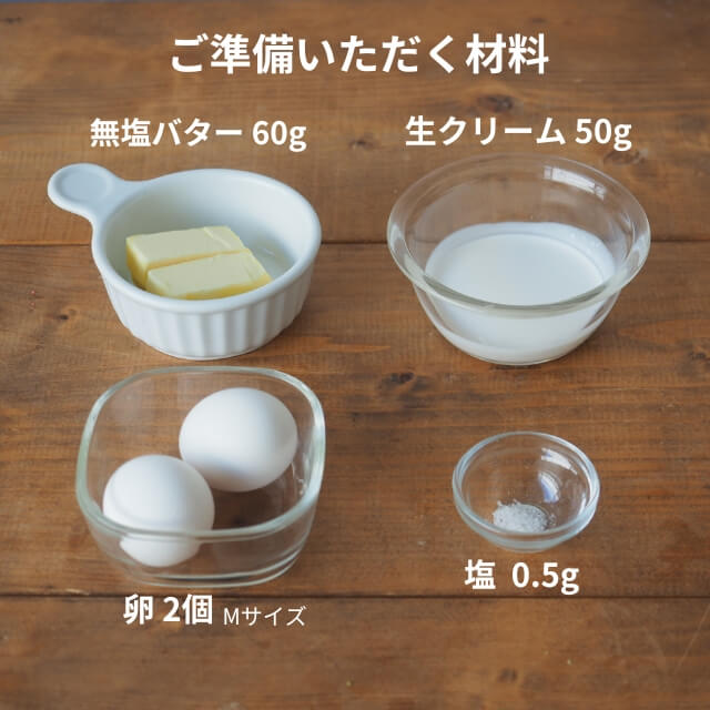 卵Mサイズ2個、塩0.5g、無塩バター60g、生クリーム50g