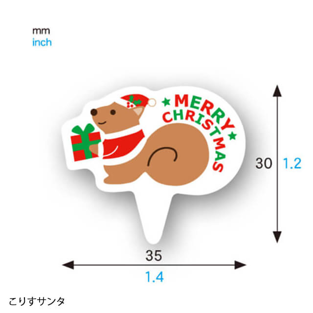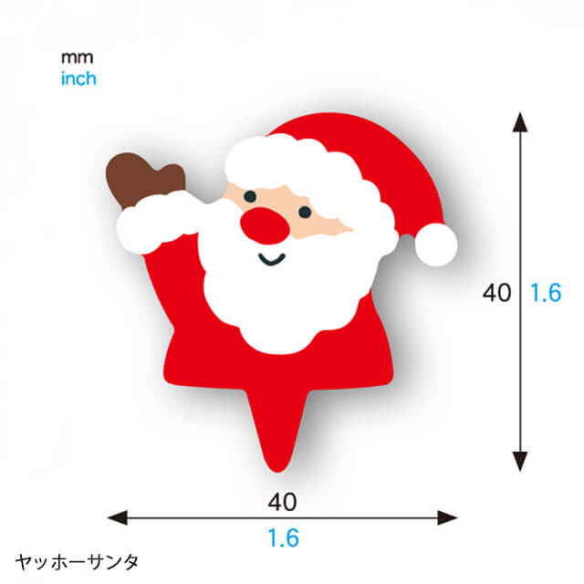 | サイズ | スマイルサンタ:30mm×38mm、カミングサンタ:30mm×40mm、キラキラツリー:32mm×40mm、こりすサンタ:35mm×30mm、ヤッホーサンタ:40mm×40mm |