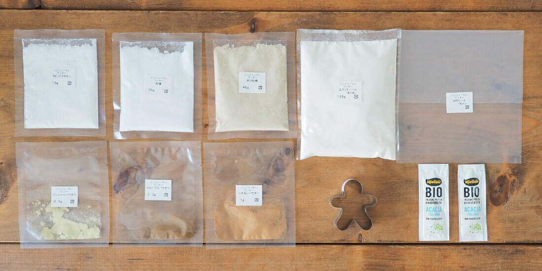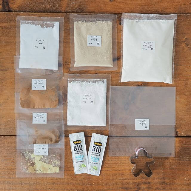 | セット内容 | きび砂糖 46g、《ミエリツィア》アカシアの有機ハチミツ 2本 (12g)、エクリチュール (薄力粉) 135g、《GABAN》シナモンパウダー 1g、《GABAN》ジンジャーパウダー 0.3g、《GABAN》クローブスパウダー 0.3g、《キユーピータマゴ》ラピッドマカロン 15g、粉糖 35g、OPPシート#25 (コルネ用)1枚、《BIRKMANN バークマン》クッキー抜型 ジンジャーマン 1個 |