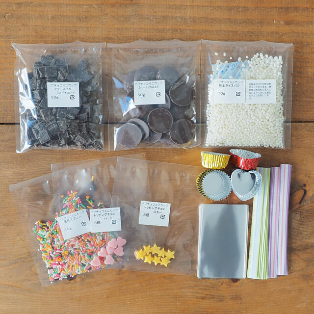 | セット内容 | 《不二製油》クーベルチュールノワール55(フレーク)(スイートチョコレート)50g、《キャラット》カバーラックス・ミルクTR 50g、特上ライスパフ 10g、五色スプレー 1袋(10g)、トッピングチョコ(ハート・スター)各8個、《シモジマ》チョコカップ(赤・金)各8個、《HEIKO》クリスタルパックS5-8 16枚、スティックストライプ(タイ)(モーブピンク・ライムブルー)各8本 |