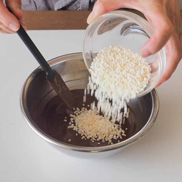 国産米を使ったライスパフです。チョコレートに混ぜると、香ばしい風味とサクサクとした食感が楽しめます。
