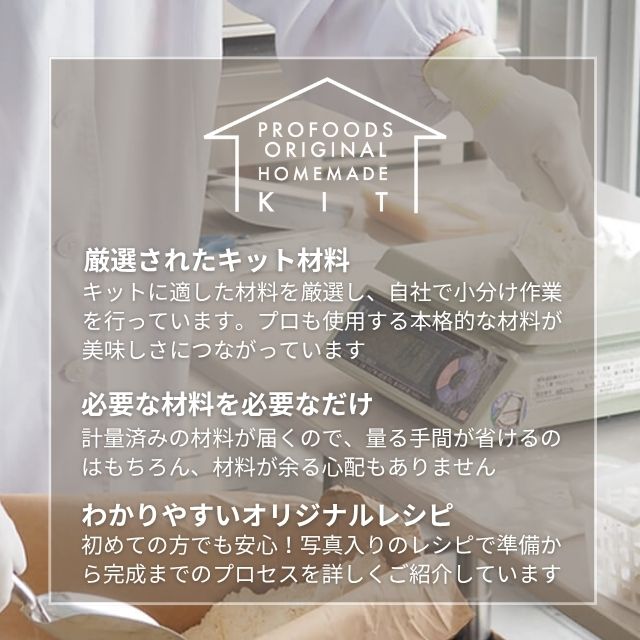 プロフーズの簡単手作りキットは、専門店ならではの高品質な材料と自分でチャレンジできる分かりやすいレシピが魅力。レシピに必要な材料がわかるよう、材料はすべて個別に包装しています。