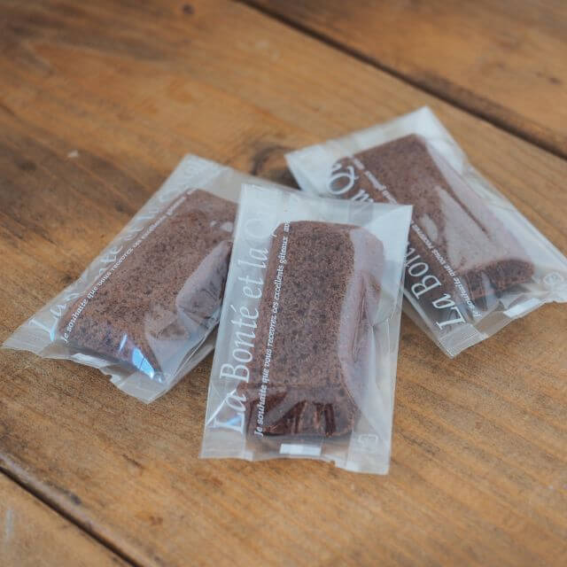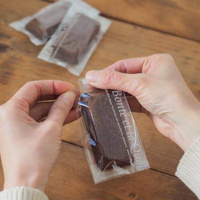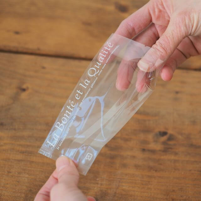 透明のマチ付き袋。前面の片側に「La Bonté et la Qualité(優しさと思いやり、そして品質)」が大きくプリントされたシンプルなデザインのギフト袋です。