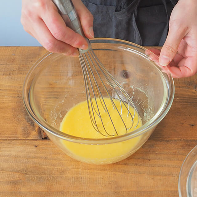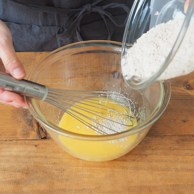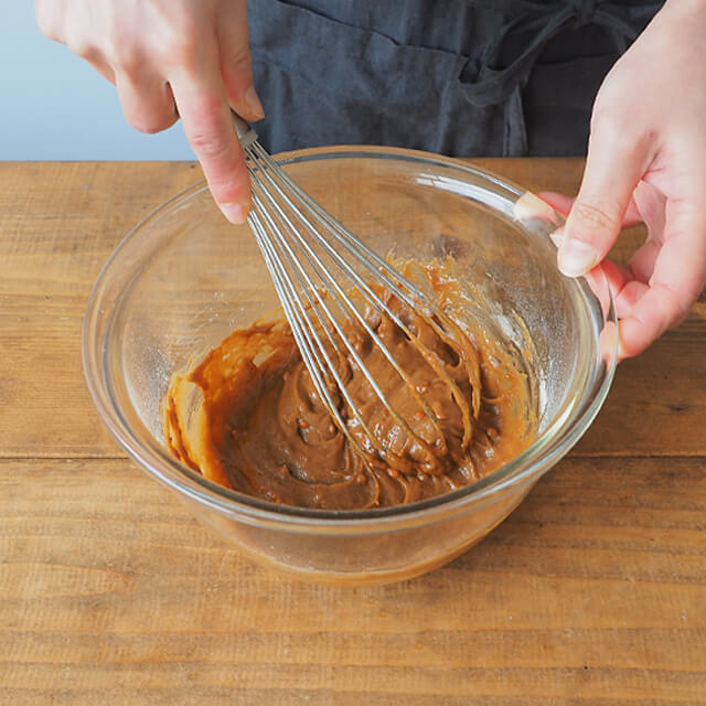 1)Aをボウルに入れてよく混ぜ合わせ、ミックス粉を加えてさらによく混ぜる。準備しておいた型に流し入れる。
