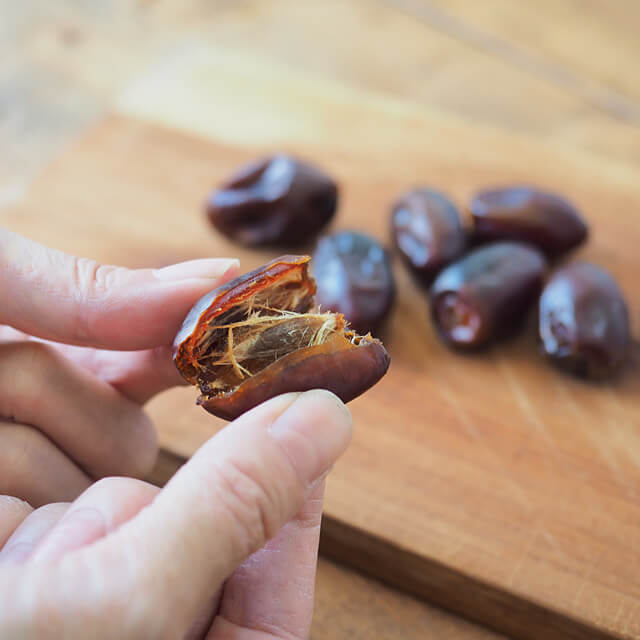グミのような食感と甘さ控えめのセミドライのデーツです。粒の表面はきれいな自然の光沢があり、赤みを帯びたブラウン色と小さめの種が特長です。ベトつきもなく、皮も薄いので簡単に手でさいて食べることができます。