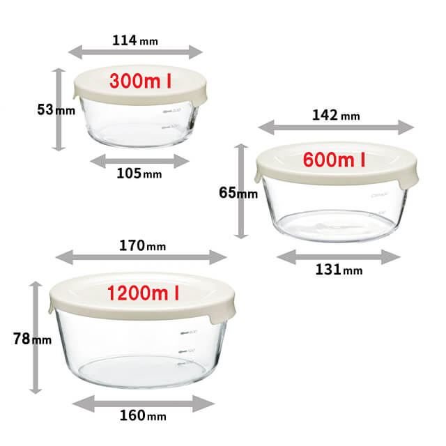 | サイズ | ・300ml Φ114(底105)×高53mm ・600ml Φ142(底131)×高65mm ・1200ml Φ170(底160)×高78mm |