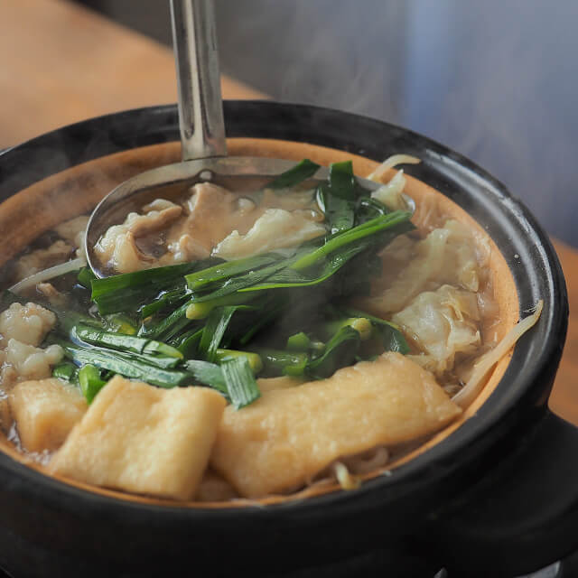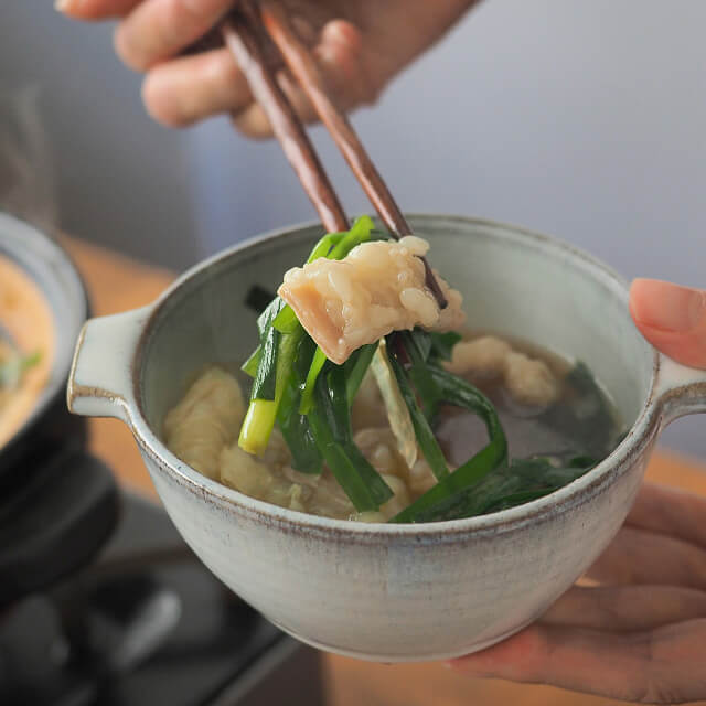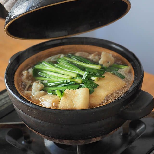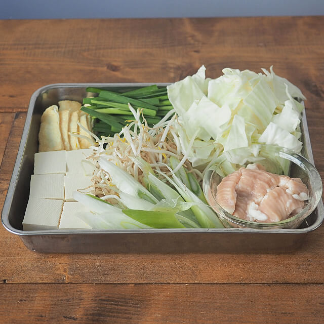 | 作り方(3~4人前) | 【材料】 牛もつ…400g キャベツ…1/2玉 ニラ…2束 ごぼう…100g 本品…1袋 ※お好みでニンニクスライス、輪切唐辛子、いりごまを加えてください。 【作り方】 1)生の牛もつは、沸騰したお湯でさっと湯通しする。 2)鍋に本品1袋と水600ccを入れ、煮立ったら、牛もつ、キャベツ、ごぼうを加える。 3)キャベツとごぼうに火が通ったら、ニラを加え、ひと煮立ちしたら出来上がり。 ※〆に中華麺を入れてお召し上がりください。 |