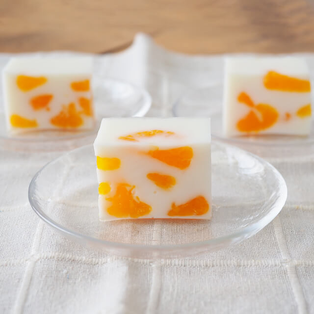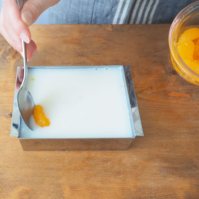 2)火を止め、牛乳を入れて混ぜ合わせ、水で濡らした型に流し込み、そこにみかんをバランス良く入れる。