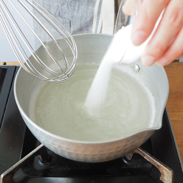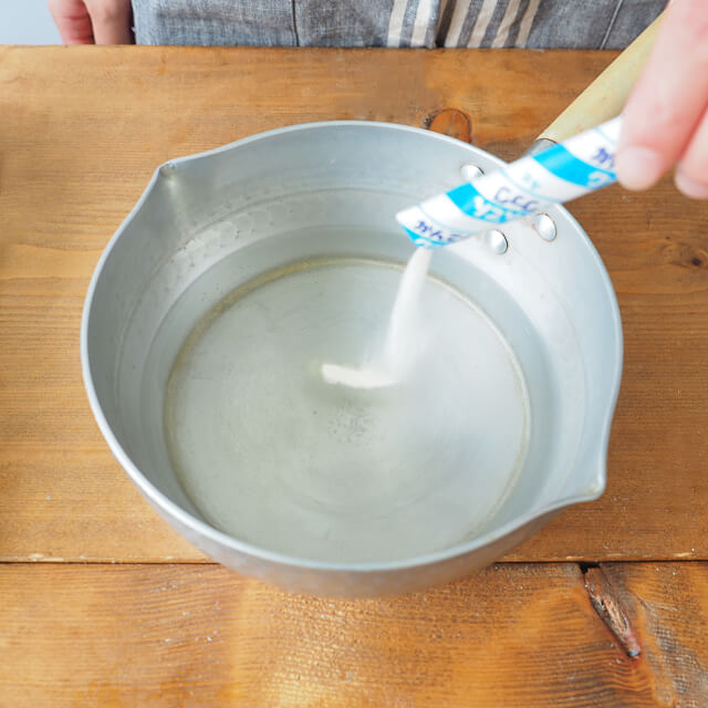 1)鍋に水と寒天クック1袋(4g)を入れてかき混ぜながら火にかけ、沸騰したら火を弱めて、さらに2分程かき混ぜ、砂糖を入れて溶かす。