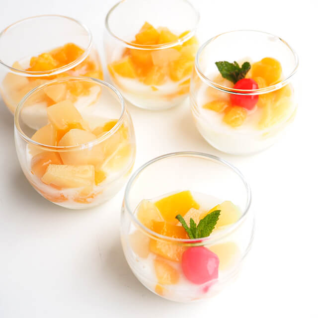 黄桃、洋なし、パイン、ぶどう、さくらんぼをミックスさせています。