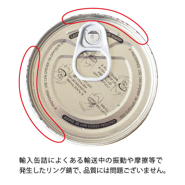 ※輸入缶詰によくある、輸送中の振動や摩擦等でリング錆が発生している場合がございますが、品質には問題ございません。