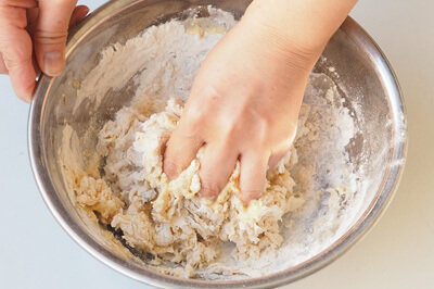 | 1)【 こねる 】 ボールにAの材料を入れて混ぜ、Bの材料を加え粉気がなくなるまで混ぜ合わせる。 |
