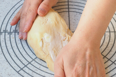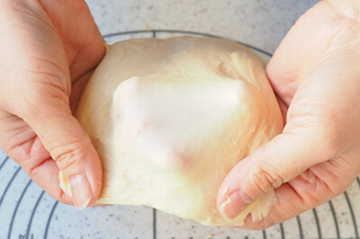 | 台の上に出して約10分こね、無塩バターを加えてさらに約10分、生地が滑らかになるまでこねる。 ※目安:生地を引き伸ばしたとき、薄い膜(グルテン膜)ができるくらいまで。 |