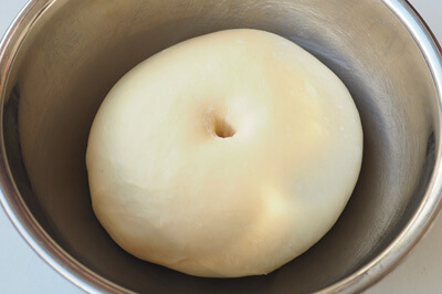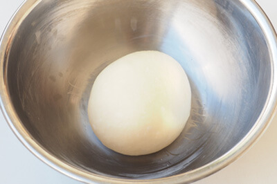 | 2)【 一次発酵 】 生地を丸くまとめ、とじ目を下にしてボールに入れラップをかける。35℃で約40分、生地が2倍の大きさになるまで発酵させる。 ※発酵の目安:粉をつけた指を差し、指の跡が残る程度(フィンガーテスト)。 |