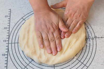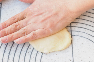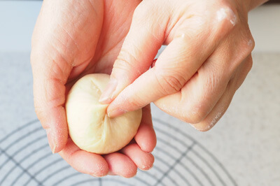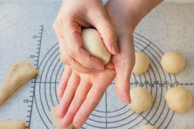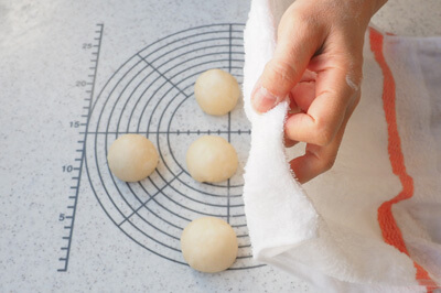 | 3)【 分割・ベンチタイム 】 生地を軽く押さえてガスを抜き、10分割する。それぞれ丸め直し、とじ目を下にし、ラップや濡れ布巾をかけて15分ベンチタイムをとる。 ※ベンチタイム:触って傷ついた生地を休ませること。 |