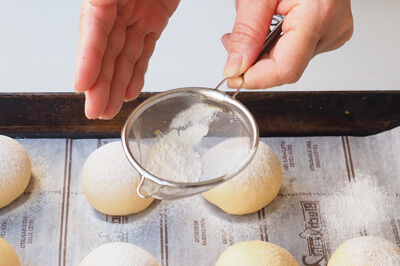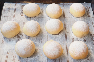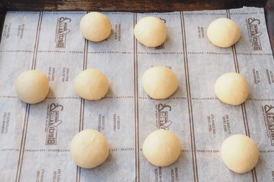 | 4)【 成形・二次発酵 】 生地を軽く押さえてガスを抜き、それぞれ丸めなおす。 とじ目を下にしオーブンシートを敷いた天板に並べ35℃で約40分発酵させる。 |