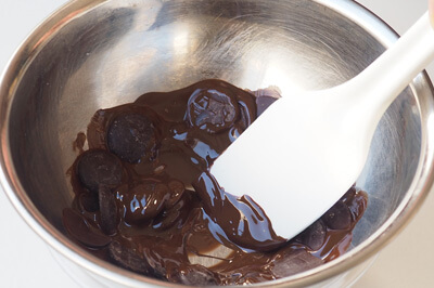 | 6)【 ガナッシュ 】 ノワール・セレクシオン(スイートチョコレート)を湯せんで溶かし、沸騰直前まで温めた生クリームを加える。 中央からくるくると混ぜ、乳化させる。無塩バターを加えて混ぜ合わせ、冷ます。冷めたら絞り袋に入れておく。 |