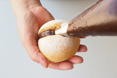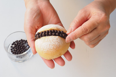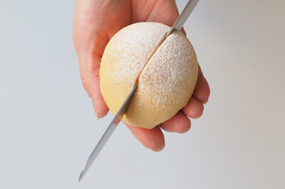 | 7)【 仕上げ 】 まるぱんの中央に縦に切り込みを入れ、冷ましたガナッシュを絞り入れる。その上にパールショコラをトッピングする。 |