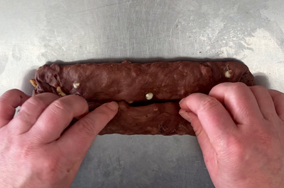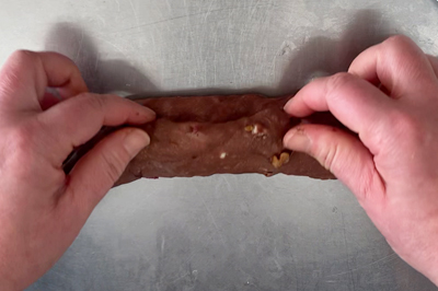 | 生地の両サイドを中央に向かって折りたたみ、さらに二つ折りにして、とじ目をしっかりと合わせる。 |