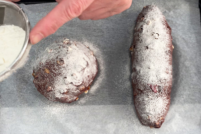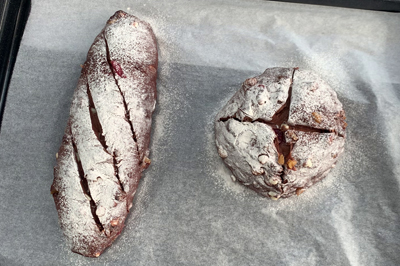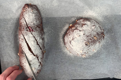 | 5)【 焼成 】 生地に春よこい100%(分量外)を茶漉しでかけ、数本クープを入れる。220℃に温めたオーブンに入れ、200℃に下げ約20~25分焼く。 ※焼き時間・温度はお使いのオーブンによって調節してください。 |