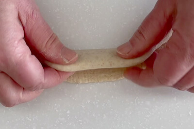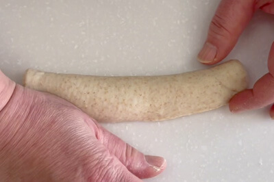 | 4-1)【 成形 】 生地を軽く押さえてガスを抜き、とじ目を上にして麺棒で横12cm程度の楕円に伸ばす。 生地を手前から中央に折り畳みしっかりとくっつける。 さらに、手前から奥の端に合わせるように折りたたみ、とじ目をしっかりと閉じる。 ※とじ目が一直線になるようにしっかりととじる。 |