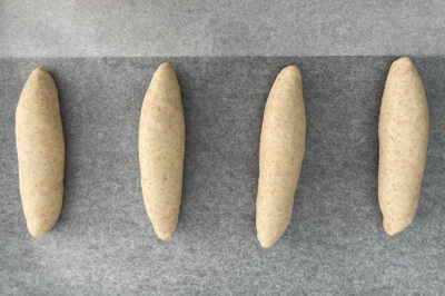 | 5)【 二次発酵 】 とじ目を下にし、オーブンシートを敷いた天板に並べ35℃で40分発酵させる。 |