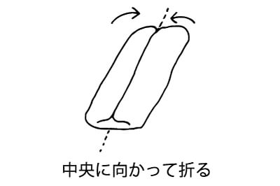 | 4)【成形・二次発酵】 生地を手のひらで軽くつぶしてガス抜きをし、めん棒で15cm程度の楕円形に伸ばす。 生地の向きを横長になるように変え、上下の生地を中心に向かって折り、とじ目をしっかり閉じる。 生地を転がして少し伸ばしたら片端を平らに広げ、円を作るように反対側の端をのせて包み、とじ目をしっかり閉じる。 オーブンシートを敷いた天板に生地を並べ、35℃で20分発酵させる。 オーブンを210℃に温める。 |