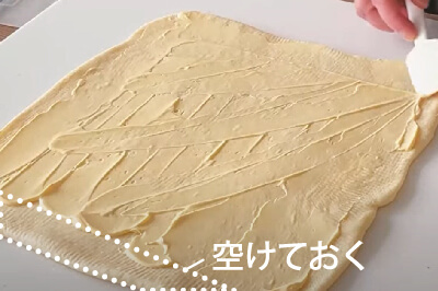 | 4)【成形・二次発酵】 軽く打ち粉(分量外)をし、生地を押さえてガスを抜き、裏返してめん棒で縦28cm×横25cm程度にのばす。 上2cmを空けてマヨネーズを塗る。 |