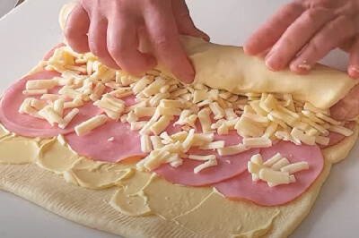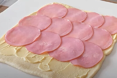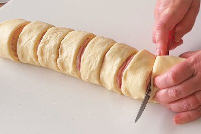 ふんわり柔らか食感の生地にハムとチーズを巻き込みました。トッピングにもチーズをのせて。