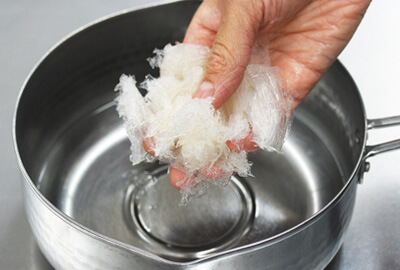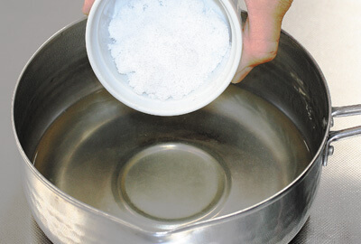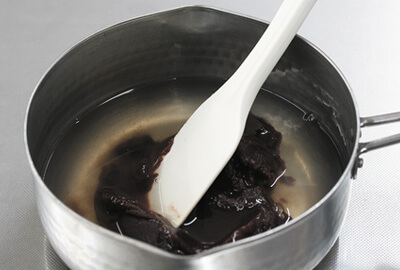 | 1)鍋に水と準備しておいた角かんてん(水気をしっかりときる)を入れる。鍋を火にかけ角かんてんが溶けるまで加熱する。 | ![]() |