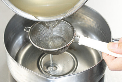 | 2)火から降ろした1に上白糖を加えて溶かす。 上白糖が溶けたら一度茶こしなどで濾す。 | ![]() ![]() |